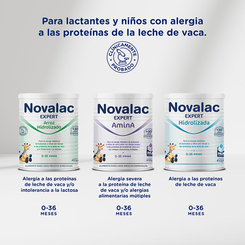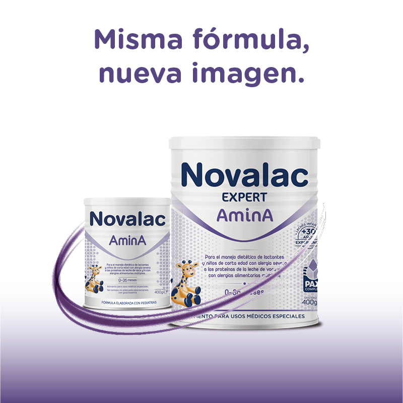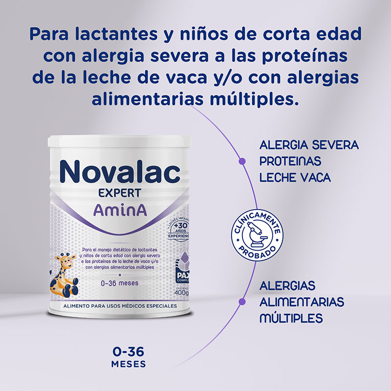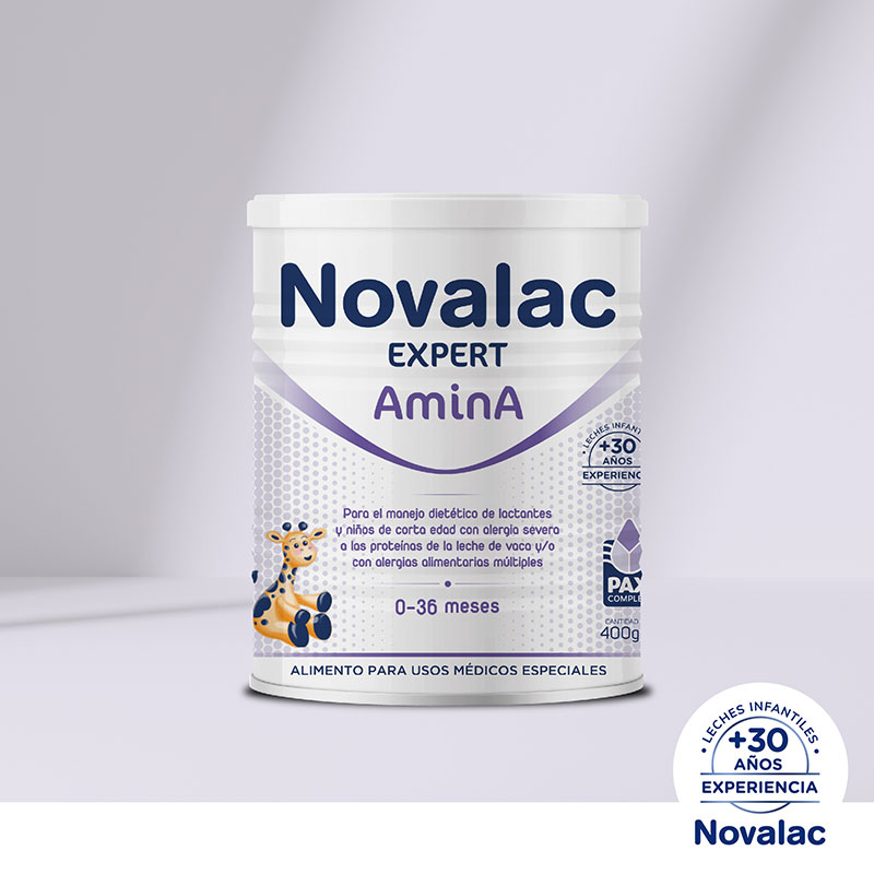 Novalac Expert AminA es una fórmula espesada, hipoalergénica, a base de aminoácidos libres y exenta de proteínas de leche de vaca. Novalac Expert AminA ha sido especialmente diseñada para el manejo dietético de lactantes y niños de corta edad con alergia severa a las proteínas de leche de vaca y/o con alergias alimentarias múltiples, toleren o no, las fórmulas extensivamente hidrolizadas.