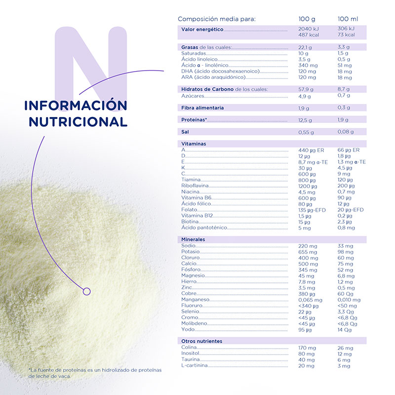 A partir de los 6 meses, Novalac Expert AminA cubre los requerimientos nutricionales como parte de una dieta diversificada, que deberá introducirse progresivamente siguiendo los consejos de su pediatra. Un uso prolongado como única fuente alimentaria en la dieta, sólo debe realizarse con una adecuada monitorización del estado nutricional por el pediatra y en función del caso.