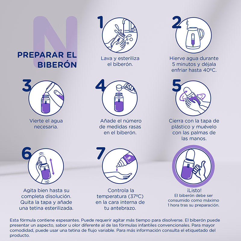 Los niños prematuros, recién nacidos de bajo peso, o inmunodeprimidos, deben ser evaluados previamente por un pediatra. Siga las instrucciones del pediatra, y no introduzca en la dieta habitual del bebé sin su consentimiento, productos que contengan proteínas lácteas (cereales con leche, derivados lácteos…). No cambie de fórmula sin el consejo de su pediatra. No administrar por via parenteral.
